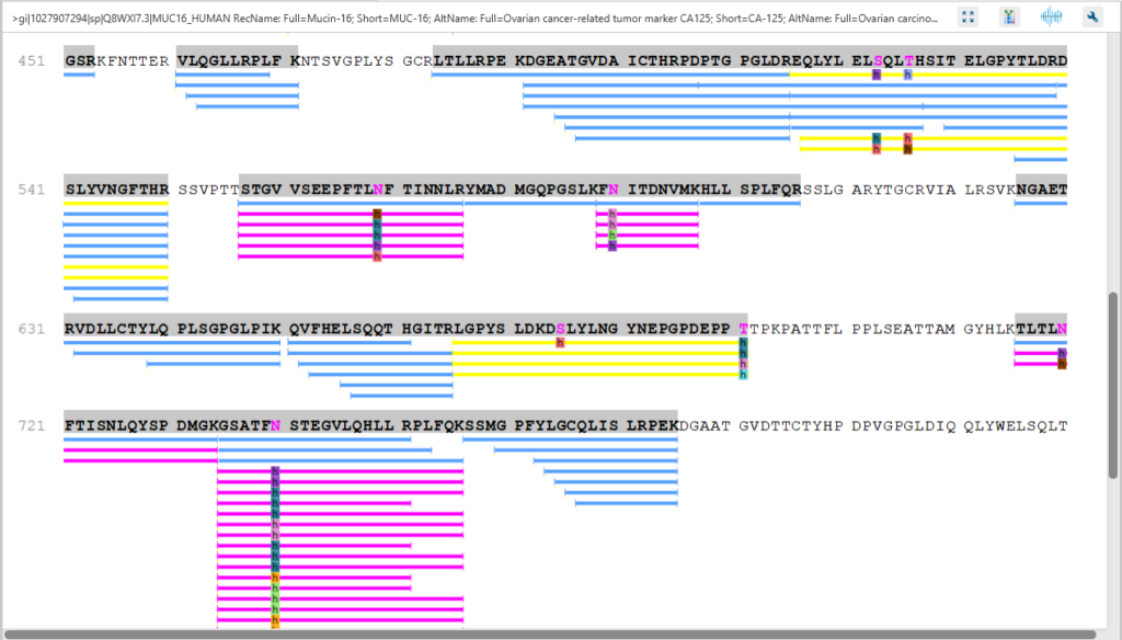 蛋白质覆盖视图(Protein Coverage View)以可视化的形式将该蛋白的归属肽段和de novo标签映射到所选中的蛋白中。它还显示了所有具有修饰或突变的鉴定位点,以协助在氨基酸水平上进行蛋白质表征。