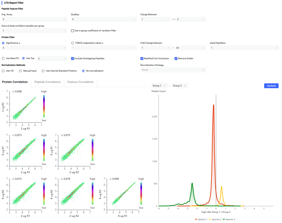 新增可视化工具包括相关性散点图和密度比率图。蛋白质定量采用灵活策略,可选择基于前3条独特肽段或所有独特肽段的MaxLFQ算法进行计算。归一化策略新增保留时间依赖型(RT Dependent)和全局型(Global)两种选项。