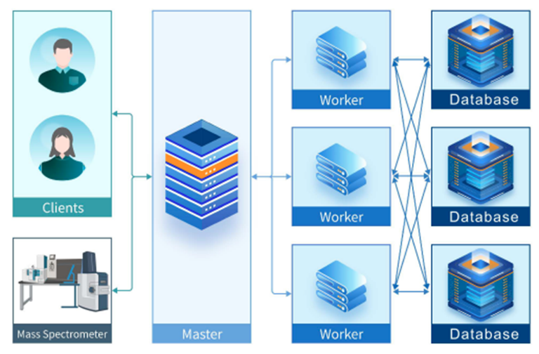 PEAKS Online 采用最新分布式计算技术,为网络中的多用户提供高通量运算性能,支持同时运行PEAKS工作流。系统以主节点为核心,负责接收来自客户端的计算请求,并将计算任务分配给工作节点。工作节点执行实际的数据处理与计算任务,确保系统高效运行。