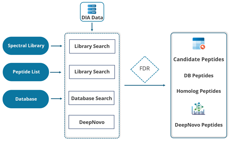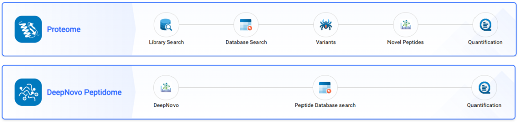 DeepNovo 多肽组工作流通过整合全面的基因数据库,弥合蛋白质组学与基因组学之间的研究鸿沟。DDA Peptidome 工作流支持非经典参考序列,能够鉴定标准经典参考数据库中常被遗漏的变异肽段和修饰肽段。DIA Peptidome 工作流现已支持谱库与靶向肽段列表功能,可针对样本中预期存在的目标肽段的精准检索。