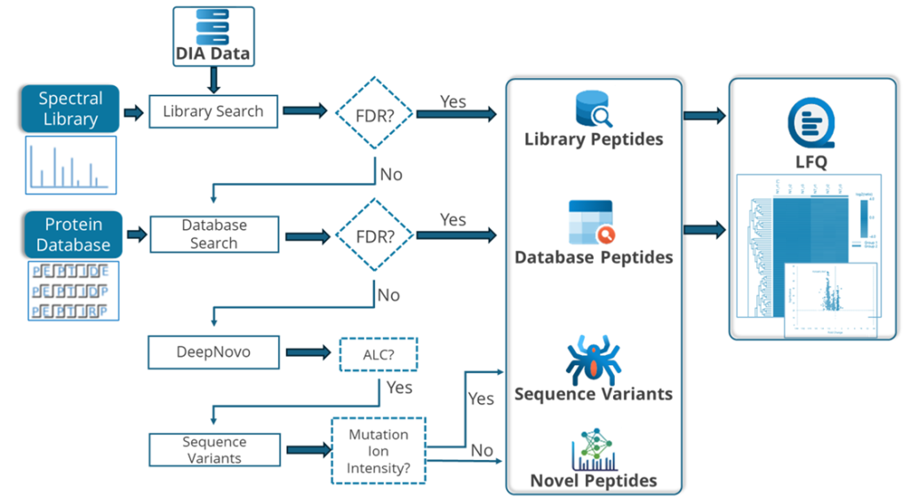 PEAKS 为 DIA 数据分析提供了稳健的解决方案。首先,系统可选择性地对预先构建的谱图库进行匹配搜索。通过估算假阳性率(FDR),将通过筛选的肽段结果保留。未能在FDR阈值范围内匹配到肽段的MS/MS谱图将进入直接数据库搜索阶段,高置信度的数据库匹配结果将被纳入最终分析结果。随后,数据库搜索中未能匹配的谱图将通过从头测序(de novo sequencing)进行分析。通过平均局部置信度评分筛选的肽段将进一步提交至SPIDER算法进行后续分析。