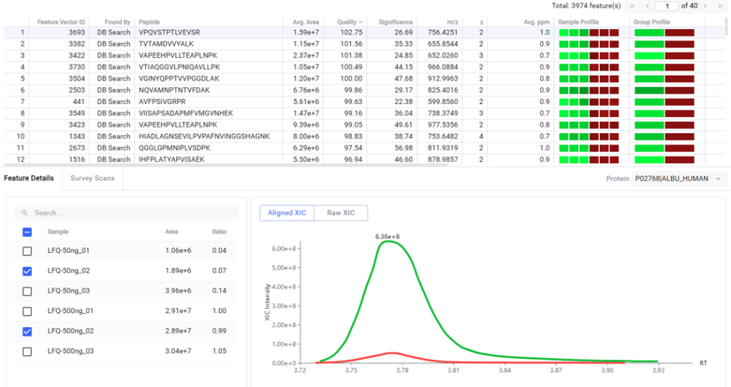 PEAKS Q 助力精准发现蛋白质表达变化。用户可针对样本间肽段/蛋白质的表达丰度差异进行深入分析,为 DDA 与 DIA 工作流提供精准可靠的定量分析结果。
