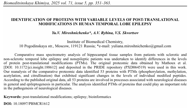 蛋白质会发生磷酸化、泛素化、乙酰化和甲基化等翻译后修饰(PTM)。这些修饰在信号传导、调控作用、蛋白质活性维持及基因表达控制等众多生物学功能中发挥着关键作用。已知许多神经系统疾病的病理进展都与翻译后修饰的异常调控密切相关。精准鉴定与表征这些修饰,对于全面理解细胞生物学机制及疾病发病原理至关重要。《生物医学化学》(Biomeditsinskaya Khimiya)近期发表的一项研究,深入探讨了翻译后修饰在成人颞叶癫痫(TLE)发病机制中的作用。
